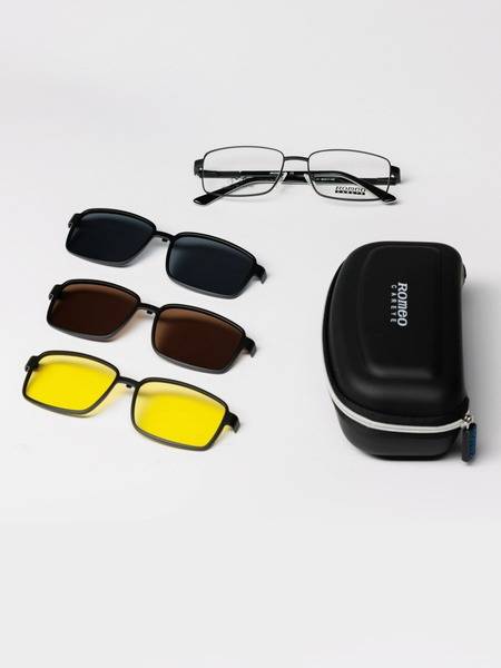 Experience the versatility of Romeo Careye men's eyewear – a titanium frame with 4-in-1 magnetic clip-on sunglasses. This stylish accessory makes a perfect gift for the discerning man who values both vision and fashion. The lightweight titanium frame boasts a classic rectangular shape, complementing most face types and featuring a comfortable silicone nose pad. The real innovation lies in the three included magnetic clip-on lenses: black, brown, and yellow. These durable Ultem lenses, resistant to temperature changes and boasting long-lasting shape retention, offer polarized protection, eliminating glare and reducing eye strain. Each colored lens offers Category 3 sun protection (8-18% visible light transmission), with 100% UV400 protection. Easily swap the demo lenses for prescription lenses, clear lenses, or blue light filtering lenses for optimal computer and screen use. Whether in the office, outdoors, or behind the wheel, Romeo Careye sunglasses offer unparalleled style and functionality, making them an indispensable accessory for the modern man.