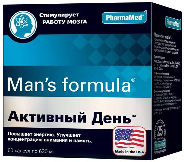Keywords: Man's Formula, Active Day, men's supplement, energy booster, focus enhancer, memory improvement, stamina supplement, herbal supplement, male enhancement, cognitive function, vitality, ginseng, ginkgo biloba, guarana, green tea, kola nut, echinacea, hawthorn, ginger root, cayenne pepper, niacin, cyanocobalamin, B12, dietary supplement, health supplement.