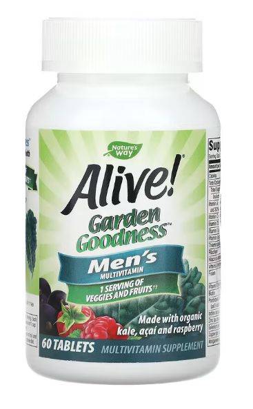 Nature's Way Alive! Garden Goodness Men's Multivitamin is ideal for active men committed to maintaining their health and vitality. Each bottle contains 60 tablets, providing a convenient and effective way to supplement your daily diet with essential nutrients. Experience the difference whole-food nutrition can make.