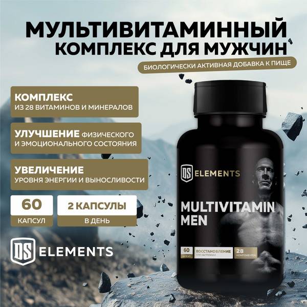 Keywords: men's multivitamin, multivitamin for men, men's health supplements, vitamins for men, male multivitamin, DS Elements, energy boost, immune support, cardiovascular health, testosterone support, antioxidant protection, bone health, muscle health, 830mg, 60 capsules, daily multivitamin, men's wellness, male vitality, healthy aging.
