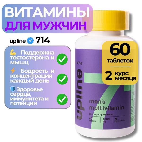 Support your overall health and well-being with Upline #714, a comprehensive men's multivitamin and mineral complex. This powerful formula contains 28 essential vitamins and minerals to support bone health, cardiovascular function, and men's reproductive health. Benefits include immune system support, improved metabolism, enhanced skin, hair, and nail health, and reduced risk of osteoporosis. Each tablet delivers key nutrients including Vitamin A, C, E, B-complex vitamins, Vitamin D3, K1, and essential minerals like Calcium, Magnesium, and Zinc. One tablet daily, for a one-month supply. Safe for repeated use throughout the year. *(See full ingredient list below)*