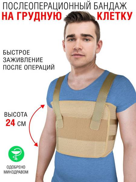 Medical-grade chest support bandage O-23, designed by physicians and certified for medical use, provides essential support and stabilization for the chest after surgery. Ideal for post-operative recovery from heart surgery and other chest procedures, this bandage also aids in healing and improves breathing after rib fractures. Specifically designed for men's anatomy, it offers comfortable, secure fixation and reduces stress on injured areas. By normalizing intra-thoracic pressure, it promotes efficient rehabilitation. This high-quality bandage is made from breathable, soft materials to prevent skin irritation, ensuring comfortable, all-day wear. Individual sizing is recommended based on physician advice.