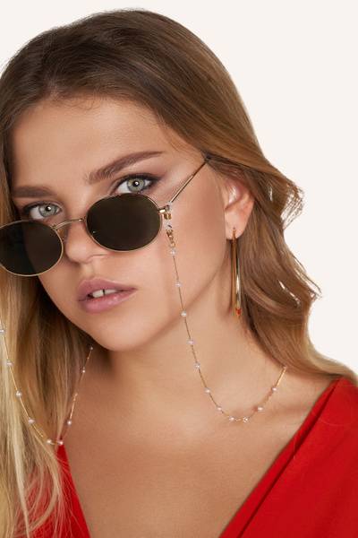 This elegant MERSADA "Miss Stevens" eyeglass chain is crafted from a hypoallergenic jewelry alloy, ensuring comfortable wear without skin irritation. More than just a stylish accessory, it provides practical protection against accidental drops and loss. The lightweight chain features delicate pearls with a lustrous sheen. Secure silicone loops keep your glasses safely attached. Chain length: 73cm.