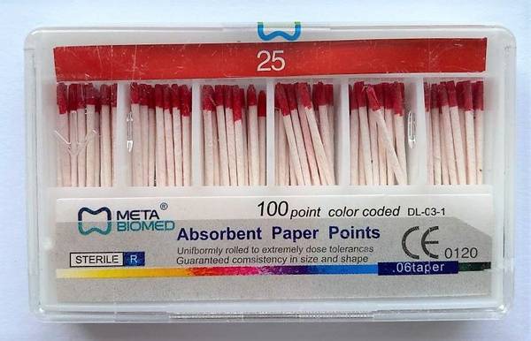 paper points, absorbent paper points, endodontic paper points, root canal paper points, dental paper points, size 25 paper points, .06 taper paper points, Meta Biomed, ISO standard paper points, root canal drying, endodontic supplies, dental supplies, cellulose paper points, 100 pack paper points, high absorbency paper points.