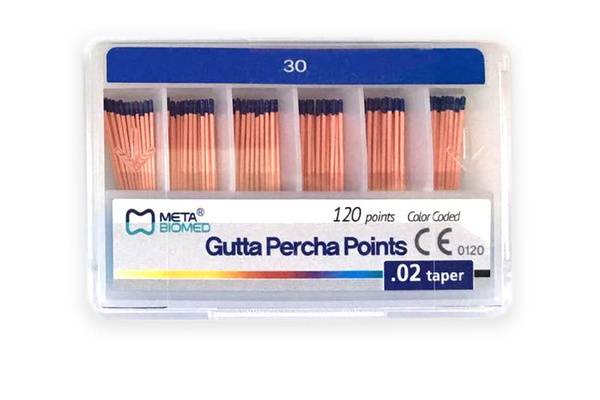 High-quality Meta Biomed gutta-percha points for reliable, long-lasting root canal obturation. Size 30 (0.2 cone), 120 points per pack. Features optimal plasticity, high radiopacity, and precise ISO sizing for easy handling and superior obturation. Made from homogeneous, biocompatible natural gutta-percha.