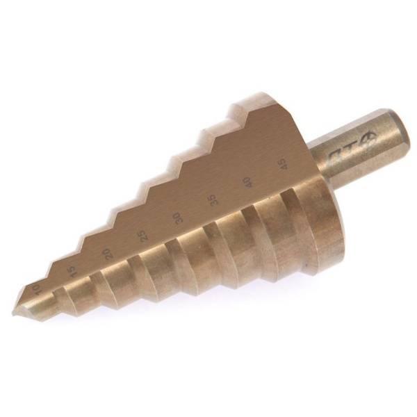This high-performance, cobalt-alloy step drill bit from Delo Techniki boasts exceptional wear resistance. Ideal for thin to medium-gauge sheet metal, it creates perfectly round holes without the need for centering tools. Featuring 8 steps (10, 15, 20, 25, 30, 35, 40, 45mm), a 13mm shank, and a 9mm step height, this durable bit is constructed from R6M5K5 steel with a hardness rating of 64-67 HRC. Perfect for professionals and DIY enthusiasts alike.
