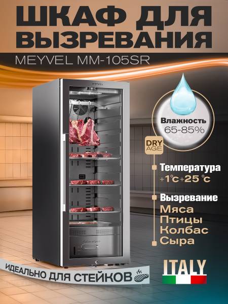 The Meyvel MM-105SR compressor-based dry-aging refrigerator is the perfect solution for restaurants, bars, or butcher shops. This freestanding meat refrigerator boasts a 172-liter capacity, holding up to 105 kg of meat and providing optimal dry-aging conditions. Its wide temperature range of +1°C to +25°C allows for precise control tailored to different meats. The stainless steel body and glass door offer both practicality and a sophisticated appearance suitable for any establishment. Internally, the refrigerator features adjustable feet for leveling, integrated hooks, a salt tray, and stainless steel shelves for easy organization and efficient drying. A water reservoir enables humidity control between 60% and 85%, crucial for even aging. In case of power outages, the memory function retains settings, automatically restoring the temperature upon power restoration. Intuitive controls, interior lighting, an open-door alarm, and temperature deviation alerts make the Meyvel MM-105SR easy and convenient to operate.