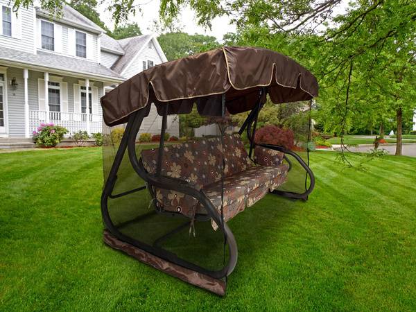 garden swing, hanging swing, outdoor swing, 3-seater swing, steel frame swing, patio swing, backyard swing, mosquito net swing, reclining swing, adjustable swing, outdoor furniture, Kalymera, Miami swing, brown swing, Russian-made swing, comfortable swing, durable swing, easy assembly swing, foldable swing.