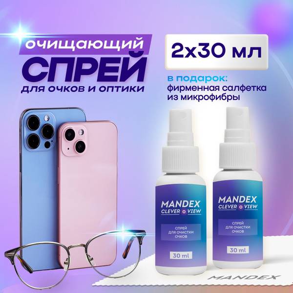 The Mandex Clever Vier lens cleaning spray is an essential accessory for cleaning and protecting all types of eyewear and optics from dirt and smudges. This effective cleaner removes dust and fingerprints without leaving streaks or scratches. Its special formula prevents dust from sticking, making it ideal for men's and women's sunglasses, and children's eyeglasses (when used with the optional soft linen case). The kit includes a high-quality microfiber cleaning cloth with the Mandex logo, ensuring quick and easy cleaning. The cloth's gentle material provides delicate care for your optics. The cleaning solution contains biodegradable, mild surfactants safe for your eyes, and medical PVP protects against irritation in case of accidental eye contact. The versatile microfiber cloth is also perfect for cleaning phones, tablets, laptops, keyboards, cameras, and even TV or computer screens. This comprehensive cleaning spray and cloth kit is also suitable for cleaning photo and video equipment and monitors.