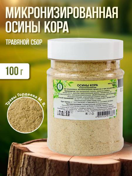 Gordeev, aspen bark, micronized aspen bark, natural remedy, anti-inflammatory, analgesic, anti-parasitic, diabetes, pancreatitis, colitis, urinary tract infection, blood sugar regulation, digestive support, liver health, opisthorchiasis, uterine fibroids, BPH, oral health, toothache, stomatitis, gingivitis, impotence, hemorrhoids, herbal remedy, natural medicine, 100g, supplement.