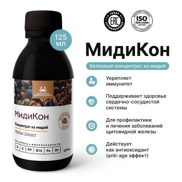 Description: Midicon is a potent concentrate derived from Black Sea mussels, brimming with bioactive compounds. This natural supplement supports metabolic function, thyroid and cardiovascular health, and offers antioxidant and anti-inflammatory benefits. Midicon helps boost immunity, increase hemoglobin levels, and reduce cholesterol, promoting vitality and well-being. Discover the power of nature's perfect blend of nutrients.