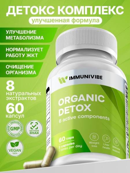 IMMUNIVIBE's Organic Detox is a potent plant-based complex formulated with natural extracts for gentle and safe body cleansing. Supporting healthy liver, kidney, and gut function, this supplement aids in weight loss, reduces bloating, and promotes clearer skin. Experience noticeable results after the very first dose. Aloe vera and senna provide mild laxative effects for natural detoxification and increased energy. Bilberry extract acts as a diuretic, reducing water retention and bloating. Schisandra berry offers a revitalizing boost, while milk thistle extract supports liver health, promoting cell regeneration and reducing inflammation. Ginger root strengthens immunity, and artichoke extract neutralizes free radicals, lowers LDL cholesterol, and supports bile flow. Suitable for vegetarians, this 100% natural formula is sugar and fructose-free, manufactured to ISO and GMP standards. Take 2 capsules daily with a meal for one month. Repeat as needed. A natural cleansing solution for weight management for both men and women.