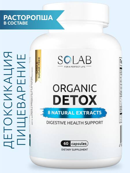 SOLAB's Organic Detox Complex is a potent blend of eight natural extracts designed to support liver, kidney, and digestive health. This antioxidant formula helps eliminate toxins and waste, promoting overall well-being. The unique combination includes artichoke leaf and birch leaf, known for their choleretic properties (stimulating bile production and flow), alongside senna and aloe, which gently support healthy bowel movements. Cranberry leaf and milk thistle extract provide additional antioxidant and liver-protective benefits, while ginger offers anti-inflammatory support and lemon balm promotes energy and circulation. This comprehensive formula helps alleviate symptoms of intoxication such as nausea, poor digestion, low energy, and acne. Ideal as a detoxifying agent, weight management aid, or intestinal cleanse, this convenient capsule formulation provides a 30-day supply (60 capsules, 2 capsules per day). Suitable for both men and women. SOLAB products are certified and registered.