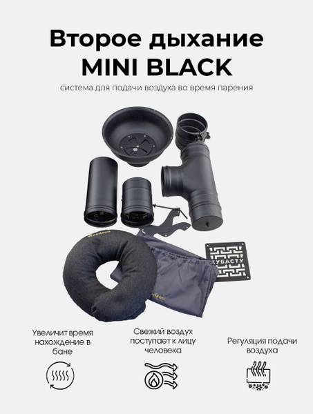 Description: Experience unparalleled comfort and invigorating steam sessions with the MINI BLACK "Second Breath" fresh air system for your sauna or steam room. This efficient and easy-to-use system delivers a personalized stream of fresh air directly to your face, enhancing your bathing experience. It also provides supplemental fresh air circulation within the entire sauna. The "Second Breath" kit includes a comfortable pillow (available in grey or brown), a regulating air intake bowl, supports, a tee connector with condensate drain plug, a 115mm diameter x 250mm tube, a 115mm diameter x 150mm rotary damper, 115mm hose clamps, and a ventilation grille. Precise air flow control is achieved via the adjustable bowl and a convenient damper. Add aromatic herbs to the bowl for an enhanced, personalized aromatherapy experience. Create the perfect sauna atmosphere with the complete "Second Breath" system – maximizing the benefits and enjoyment of your steam sessions.