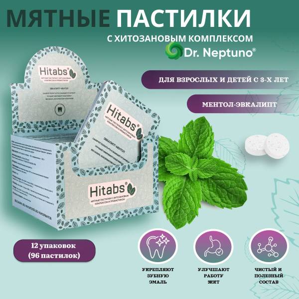 Hitabs, mint lozenges, prebiotic, chitosan, oral health, gut health, sugar-free, natural, award-winning, breath freshener, healthy snack, diabetes-friendly, gluten-free, immune support, chitosan oligosaccharide, inulin, erythritol, corn fiber, eucalyptus-menthol, Russia, clinically proven, tooth enamel, digestive health, weight management, healthy lifestyle, gift idea.