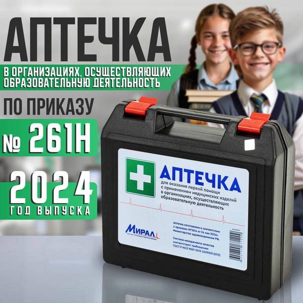 Keywords: First-aid kit, educational institution, Order 261n, Ministry of Health, Russia, medical supplies, emergency response, school safety, bandages, dressings, tourniquet, resuscitation, medical gloves, gauze pads, adhesive bandages, thermal blanket, first aid instructions.