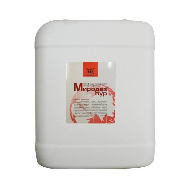 Mirodez Pur, disinfectant, concentrate, 5L, broad-spectrum, bacteria, viruses, fungi, healthcare, hospital, food service, public spaces, disinfection, alkyldimethylbenzylammonium chloride, polyhexamethylene guanidine hydrochloride, Russia, tuberculosis, HIV, influenza, Candida, Dermatophytes.