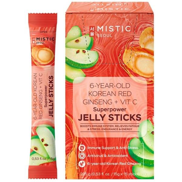 Experience the invigorating power of Mistic Superpower Jelly Sticks, a unique blend of 6-year-old Korean red ginseng extract and Vitamin C. These delicious apple-flavored jelly sticks offer a convenient and effective way to support your immune system, enhance energy levels, and sharpen mental clarity.