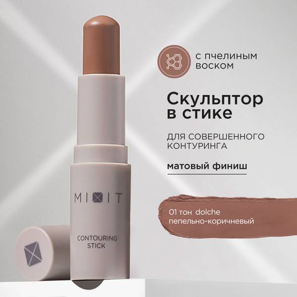 Keywords: MIXIT, contouring stick, contour stick, makeup, professional makeup, contouring, sculpting, concealer, hydrating, moisturizing, non-comedogenic, ash brown, shade 01, dolche, natural makeup, Russian cosmetics, skincare, makeup stick, mini stick, blendable, flawless finish, all skin types, sensitive skin, acne-prone skin, complexion, radiant skin, healthy skin.
