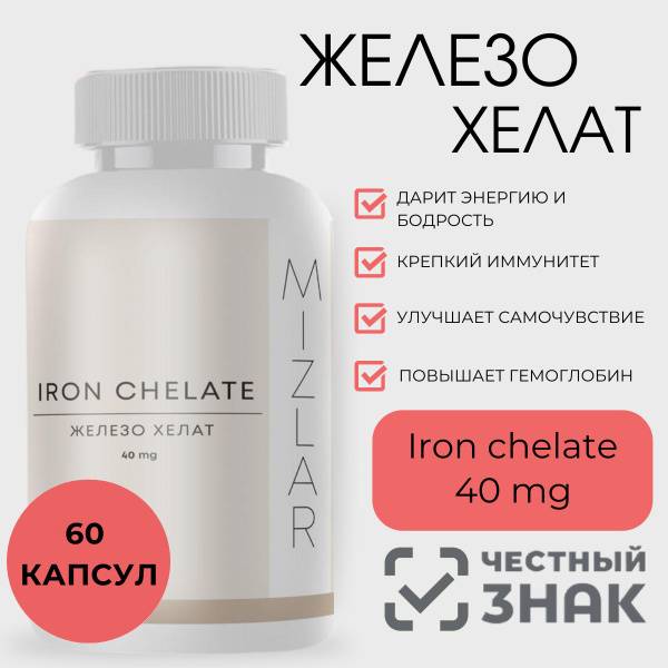 Mizlar Iron Chelate supplements replenish and normalize hemoglobin levels, vital for oxygen transport throughout your body. Essential for both men and women. 60 capsules per bottle.