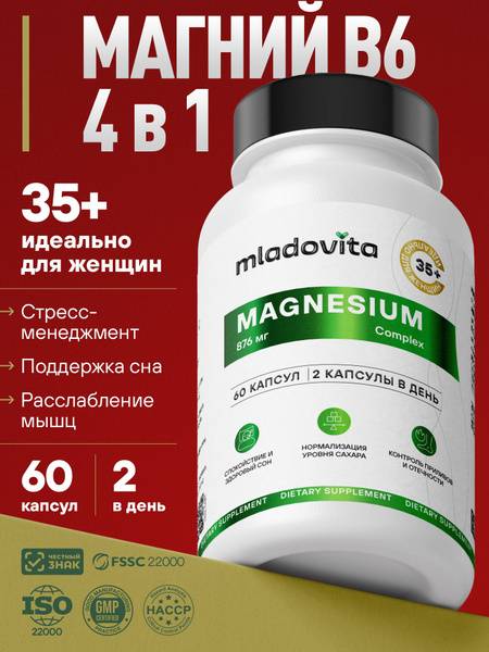 Boost your well-being with Mladovita's advanced 4-in-1 Magnesium Complex, specifically formulated for women aged 35 and beyond. This premium supplement features four highly bioavailable forms of magnesium – Malate, Taurate, Citrate, and Bisglycinate – combined with active Vitamin B6. Essential for muscle function, cardiovascular health, and a calm nervous system, this magnesium supplement supports vital metabolic processes. It aids in regulating blood sugar levels, helps reduce the risk of heart disease, and promotes restful sleep. Plus, magnesium is crucial for effective muscle recovery after workouts or physical exertion. Support your body’s essential functions and enhance your overall health with this expertly crafted blend.