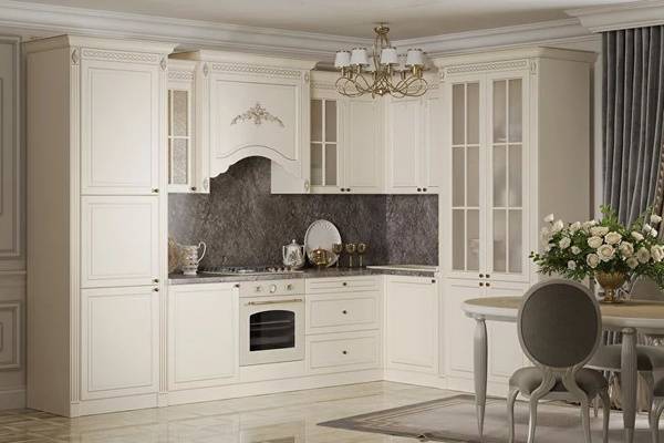 The Astoria kitchen set embodies classic elegance, enhancing the sophistication and refinement of your home. Perfect for both grand dinners and cozy family evenings, this stunning set features a luxurious ivory and gold finish. Crafted from high-quality MDF and laminated chipboard (LDB), it boasts features like soft-close hinges, full-extension drawer slides, and a durable 38mm water-resistant countertop. Dimensions: 255x155x245cm. Made in Budennovsk by Zaman.