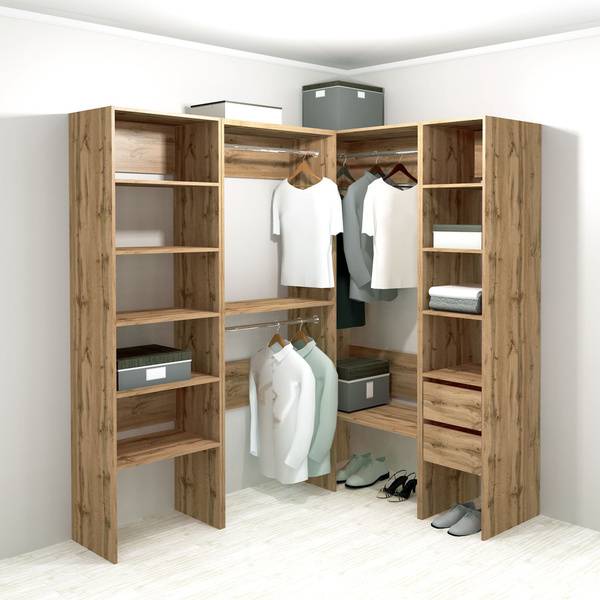 Create a custom walk-in wardrobe with the Modus #2 system. This versatile set features a mix of 40cm and 50cm deep modules, offering adaptable storage solutions. Includes: two 40cm deep units (M0106 & M0104) and two 50cm deep units (M0209 & M0201). Constructed from high-quality, water-resistant Nordeco particle board (E1/E0.5 formaldehyde emission), it boasts full-extension Boyard drawer slides, adjustable shelves, and hidden hardware for a sleek finish. Choose from shelves, drawers, and clothing rods to personalize your storage. Complete with detailed assembly instructions. 140cm W x 190cm H x 208.4cm D. Oak Votan finish.