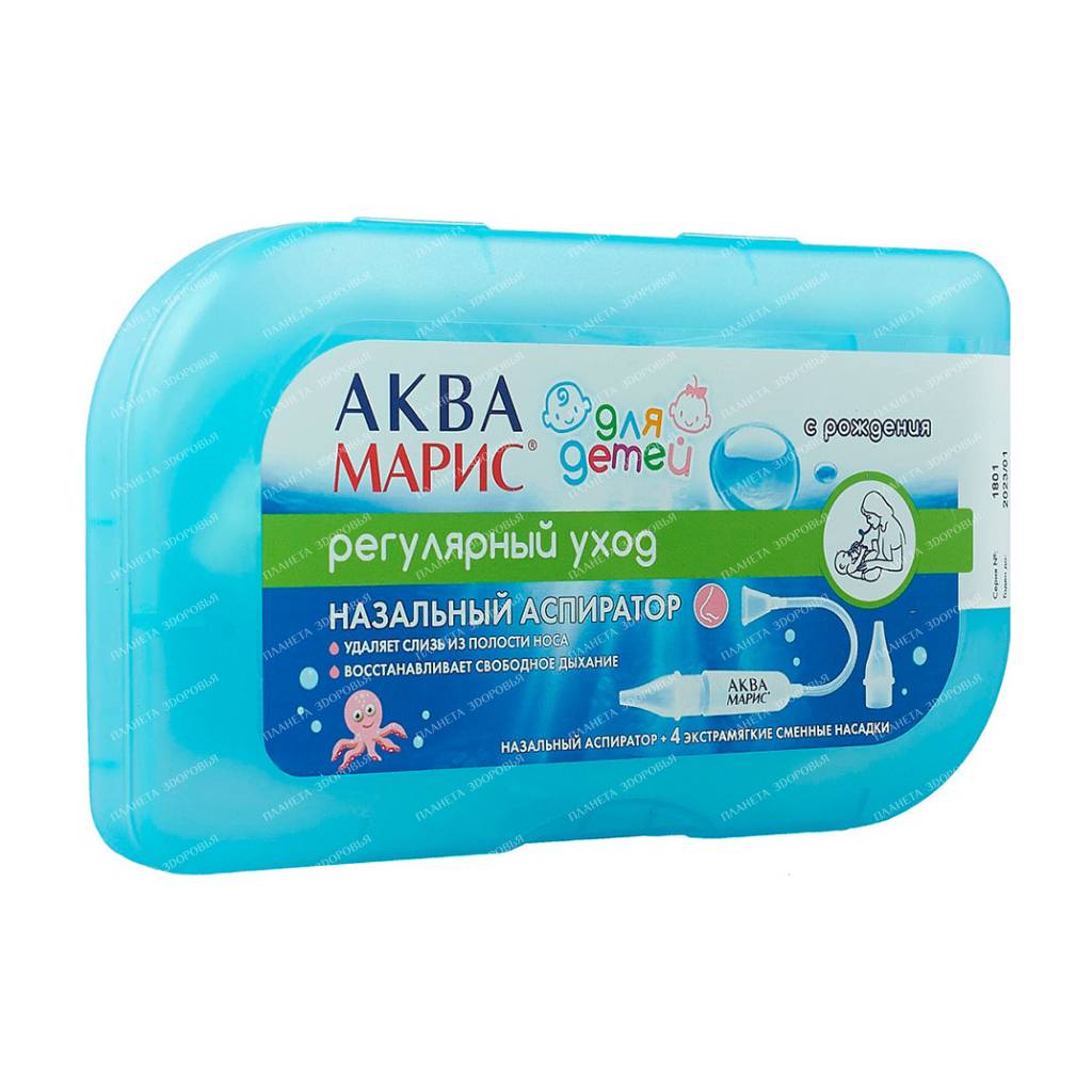 Effortlessly clear your baby's stuffy nose with the Aqua Maris Nasal Aspirator, featuring a convenient case and four replaceable nozzles. This gentle and effective solution provides relief from colds, flu, sinusitis, and other infections causing a runny nose.