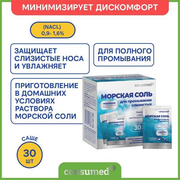 Consumed Sea Salt Nasal Rinse is a gentle, daily hygiene solution for children and adults. Each convenient 5g sachet contains purified seawater enriched with beneficial minerals and trace elements, effectively cleansing nasal passages of mucus, bacteria, viruses, and allergens. This helps reduce the risk of colds and improves nasal breathing. The saline solution relieves congestion and dryness, naturally moisturizing nasal membranes. Its anti-inflammatory properties shorten the duration of respiratory illnesses and minimize the spread of infection to sinuses and ears. Used for cleansing, moisturizing, and softening crusts, the solution features antiseptic and antimicrobial properties. Added extracts of rosehip and licorice root soothe and minimize discomfort. Ideal for daily use or during colds and allergies. 30 individually packaged sachets for ultimate convenience.