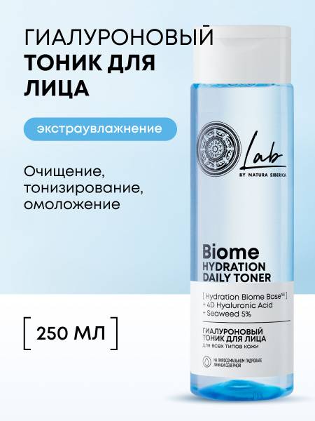 Natura Siberica Lab's Biome Hydration Daily Toner is a revitalizing hyaluronic acid facial toner suitable for all skin types. This cleansing and hydrating toner, formulated with liposomal Northern Linnaea extract, restores the skin's natural pH balance, deeply cleanses, tones, and intensely moisturizes for a supple, radiant complexion. Beneficial for both mature and young skin, this anti-aging toner combines the rejuvenating power of Northern Laminaria extract and Siberian Catnip to stimulate collagen production, improve skin texture, and normalize the hydrolipidic balance.