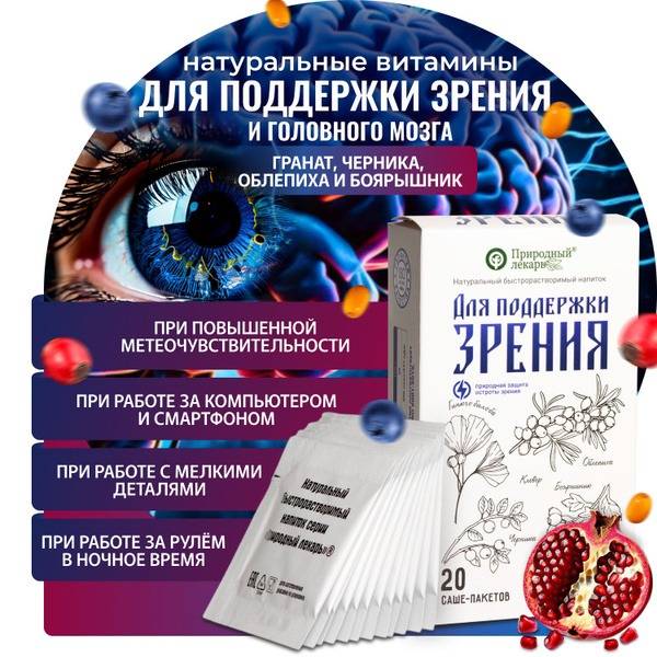 Eye health supplement, vision support, natural eye care, bilberry extract, pomegranate extract, sea buckthorn extract, hawthorn extract, ginkgo biloba, digital eye strain, eye fatigue, brain health, cognitive function, antioxidant, 20 sachets, natural vitamins, eye vitamins, Altai Phytocomplex.