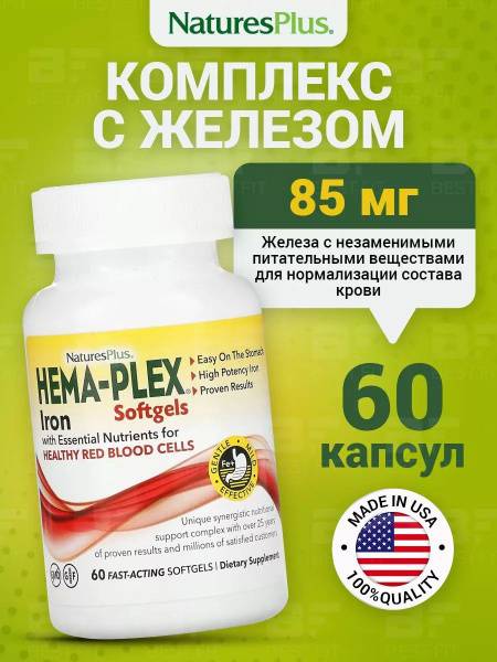 Keywords: Nature's Plus Hema-Plex, iron supplement, iron deficiency, blood health, anemia, vitamin C, calcium, amino acid chelate, gentle on stomach, gluten-free, GMO-free, dietary supplement, blood support, iron absorption, bioflavonoids, cofactors, 85mg elemental iron, 60 capsules