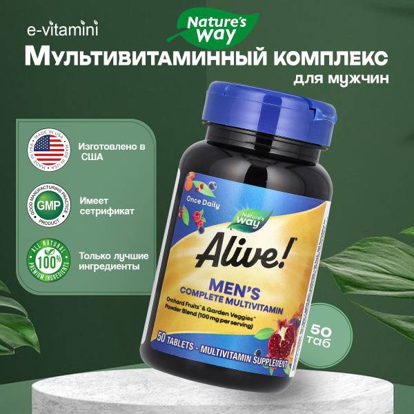 Power through your day with Nature's Way Alive! Men's Multivitamin. This comprehensive multivitamin provides a potent blend of vitamins for men, minerals for men, and carefully selected nutrient blends designed to support men's specific health needs. Feel the difference as you experience sustained energy levels, enhanced immunity, and overall improved well-being. This high potency multivitamin offers immune support and an energy boost. Don't just survive your day – thrive with Alive! This daily multivitamin is a nutritional supplement perfect for men's health and men's wellness. Order your 50-tablet supply today.