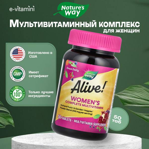 Fuel your day with Nature's Way Alive! Women's Multivitamin. This potent blend of vitamins, minerals, and whole food concentrates provides essential nutrients for vibrant health and sustained energy. Experience the Alive! difference. This women's multivitamin is a dietary supplement containing vitamins and minerals for an energy boost. Each bottle contains 50 tablets. It's a whole food multivitamin perfect for women's health supplements needs.