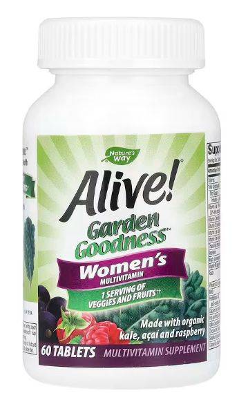 Nature's Way Alive! Garden Goodness Women's Multivitamin is perfect for women leading active lives who prioritize their well-being and want a natural way to supplement their diet with essential nutrients. Experience the Alive! difference – feel the energy, see the results, and embrace a healthier, more vibrant you. 60 tablets per bottle.