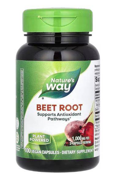 Keywords: beetroot extract, beetroot supplement, blood pressure support, circulation support, energy boost, endurance supplement, cardiovascular health, antioxidant, betalains, nitrates, betaine, liver support, detoxification, muscle recovery, athletic performance, cognitive function, memory, Nature's Way, 500mg, 100 capsules, vegetarian capsules.