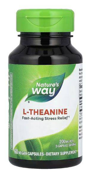 Keywords: L-Theanine, Nature's Way, stress relief, anxiety relief, focus, concentration, cognitive enhancement, memory improvement, sleep improvement, sleep aid, natural sleep aid, caffeine side effects, GABA, serotonin, dopamine, relaxation, calming, vegetarian capsules, supplement, dietary supplement, stress management, anxiety management, cognitive function, brain health, mental clarity, emotional well-being, 100mg, 60 capsules