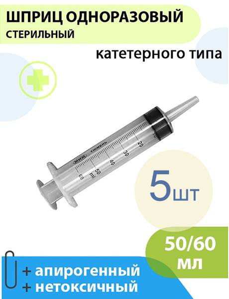 These sterile, disposable, latex-free catheter-tip syringes are designed for safe and reliable medical use. Each 5-pack contains 50/60ml syringes, individually blister-packed for hygiene and convenience. Manufactured from high-quality materials, the syringe comprises a polypropylene cylinder and plunger, with a medical-grade compound piston. The cylinder features a clear 50ml graduation scale extending to 60ml for precise measurement and a luer-lock connector for secure catheter attachment. A stopper ring prevents plunger detachment, while double piston seals ensure leak-proof performance and smooth plunger movement. Ethylene oxide sterilization ensures sterility and environmental safety. Expiration date: 5 years. Ideal for various medical applications requiring aseptic fluid delivery.