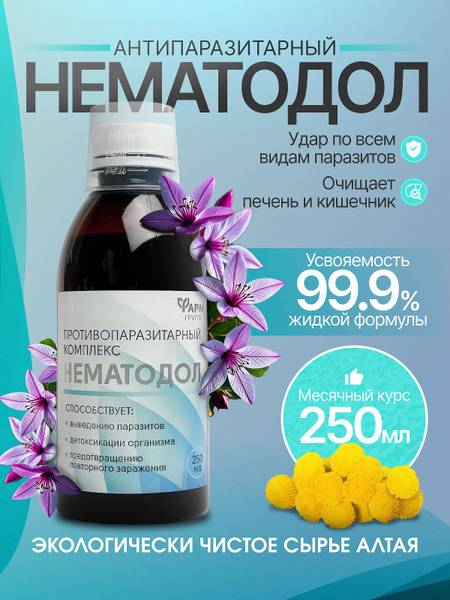 Description: Nematodol is a potent liquid antiparasitic syrup designed for complete body cleansing from all types of parasites. Formulated with the most effective antiparasitic herbs, Nematodol not only eliminates unwanted guests but also restores your health and energy. Its liquid form ensures maximum absorption of active ingredients, guaranteeing high efficacy.