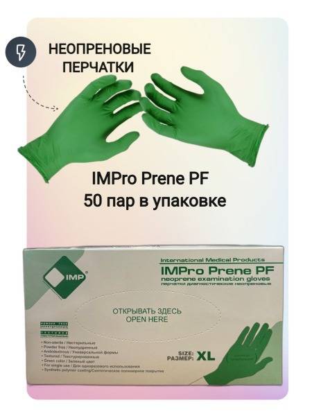 High-quality, bright green, powder-free, non-sterile nitrile examination gloves (IMPro Prene PF) – XL size, 50 pairs (100 gloves) per box. These durable, chemical resistant nitrile gloves offer superior protection against acids, alkalis, alcohols, and chemical splashes. Featuring a polyurethane inner coating for easy donning, a textured surface for secure grip, and enhanced puncture resistance, they provide exceptional flexibility and dexterity. Key features include: AQL 0.65; Finger thickness: 0.160 mm; Palm thickness: 0.130 mm; Length: 240 mm; Chlorinated inner surface with polymer coating. Compliant with CE marking (PPE Category III), EN 420 + A1, EN ISO 374-1 Type B KPT, EN ISO 374-5 (Virus), EN 421, ISO 13485:2016, EN455-1:2:3, and ASTM F1671. Registered medical device for use in Russia (Registration Certificate No. ФСЗ 2010/06177 dated September 29, 2021). GOST R 52239-2004.