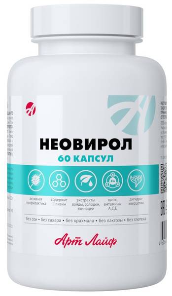 Neovirol, 60 capsules, ArtLife, immune support, viral defense, natural antiviral, plant-based, L-Lysine, Woad root extract, Licorice root, Japanese Honeysuckle, Willow bark, Echinacea, Zinc, Vitamins A C E, Quercetin, anti-inflammatory, antioxidant, immune system booster, cold and flu relief, herpes treatment, influenza, coronavirus, natural antibiotic, blood thinner, blood vessel health.