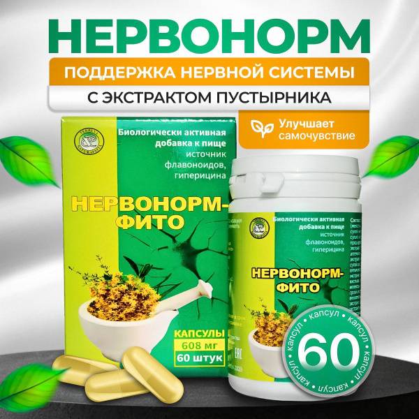 Nervonorm-Phyto is a dietary supplement and not a substitute for a healthy lifestyle or balanced diet. It is not a medicine. Consult your doctor before use, especially if you are pregnant, breastfeeding, have underlying health conditions, or are taking other medications. Adults should take one capsule daily in the evening, as it has a calming effect on the central nervous system. A one-month course is recommended, and the course can be repeated if needed. Do not use if you are allergic to any of the ingredients.