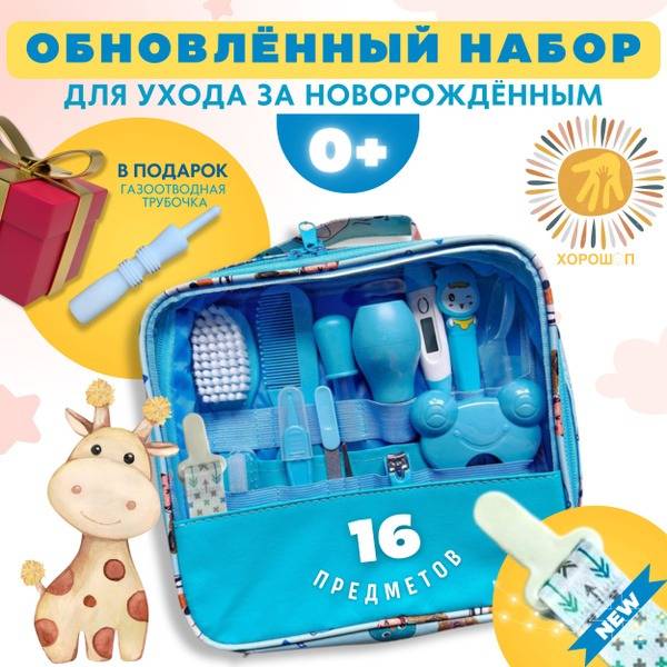 Searching for the perfect gift for a new mom or a baby's hospital discharge? Our premium 16-piece newborn baby care gift set provides essential hygiene items for baby and added comfort for mom. This comprehensive newborn hygiene kit includes: nasal aspirator, baby toy thermometer for bath time, nail clippers, measuring spoon for medicine, finger toothbrush for teething relief, eyedropper, flashlight with slender tip, tweezers, rounded-tip baby scissors, flexible tip thermometer, baby nail file, soft-bristled newborn brush, hair comb, pacifier holder, reusable gas relief tube, and a stylish cosmetic bag. This unique baby gift set is ideal for parents expecting a newborn, offering gentle and hygienic care during those precious first weeks. No need to hunt for individual items – this gift box contains everything needed for complete baby and mom care. Each item is thoughtfully designed with newborns in mind, ensuring optimal care from day one. The convenient cosmetic bag allows for easy transport to the hospital, on outings, travel, and even in the stroller. Available in three colors: blue, pink, and yellow – the perfect gift for a baby boy or girl!