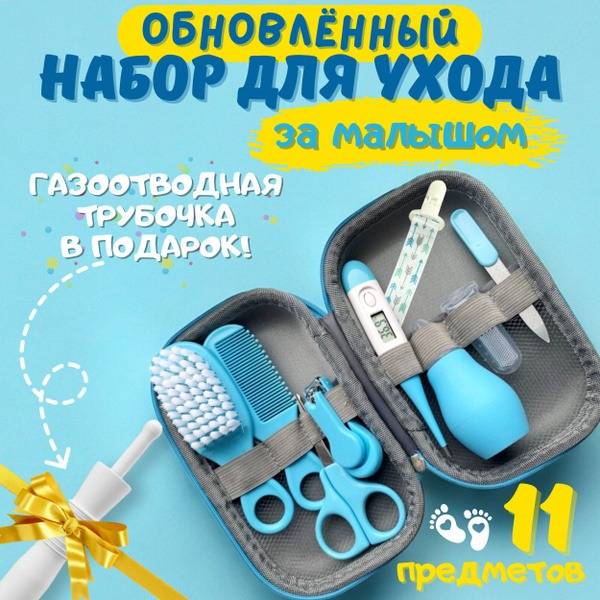 Description: Our newborn gift set is a must-have for every new mom! This complete baby care kit includes 11 essential items for baby hygiene, eliminating the need for separate purchases. The set features: a soft-bristled hairbrush and comb to gently cleanse and massage the scalp; rounded-tip baby nail scissors, clippers, and file for safe nail care; a silicone teething toothbrush to soothe sore gums; a safe and effective nasal aspirator; a digital thermometer with a flexible tip for accurate temperature readings; a pacifier holder to prevent loss and encourage fine motor skills; and a colic relief tube. All items are stored in a convenient travel-friendly cosmetic case with an additional pocket for wipes or toys. This gender-neutral set is perfect for newborns and makes an ideal gift for baby showers, hospital discharges, birthdays, or christenings. Available in three vibrant colors: pink, blue, and yellow.
