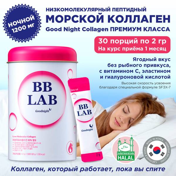 Experience the transformative power of BB LAB Good Night Collagen, a premium, Halal-certified, low molecular weight (1000 Dalton) marine collagen peptide drink. This top-selling Korean beauty supplement revitalizes your skin, boosting elasticity, smoothness, and firmness. Enjoy a delicious berry flavor, free from fishy aftertastes. Each sachet delivers 1200mg of highly absorbable collagen, visibly reducing wrinkles and fine lines for a more youthful complexion.