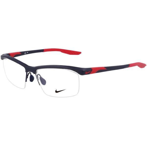 Nike eyeglasses, Nike 7402, Nike 7402 411, lightweight eyeglasses, sporty eyeglasses, prescription eyeglasses, flexible eyeglasses, comfortable eyeglasses, eyeglass frames, Nike Vision, Marchon Eyewear, red accent eyeglasses, dark blue eyeglasses, customizable nose pads, airflow eyeglasses, prescription lenses, polarized lenses, photochromic lenses, tinted lenses, 19g eyeglasses, 142mm eyeglasses.