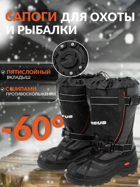 Experience superior comfort and protection with Nisus fishing boots. Crafted with a durable 600D Oxford fabric upper featuring polyurethane coating and non-woven lining, these boots provide exceptional waterproof performance. The TPU nitrile outsole offers superior grip and durability, while the two-component PU foam upper ensures lightweight comfort. An orthopedic toe roll reduces foot fatigue during extended use. Securely attached via direct injection molding, these boots feature a reflective element for enhanced safety and a top flap to prevent snow entry. A secure strap fastening system and the absence of metal parts ensure safety. Included is a five-layer insulated liner, usable as warm, standalone footwear, and a four-layer warm insole for superior comfort and warmth. Perfect for snowmobiling, hunting, fishing, and all outdoor adventures. Features include anti-slip studs and a moisture-wicking insole.