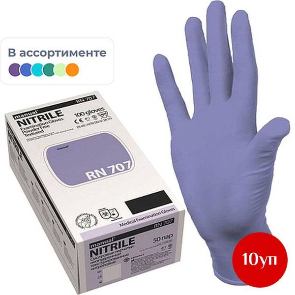 Manual RN 707 nitrile examination gloves offer superior protection and comfort. These non-sterile, powder-free, extra-durable gloves are ideal for medical, laboratory, and food service applications. Their non-anatomical design and thin gauge (0.1mm palm, 0.17mm fingers) provide excellent tactile sensitivity. The textured surface ensures a secure grip. Made in Austria, these XL gloves (240mm length, 16.3g/pair) meet ГОСТ Р 52239-2004 and ТР ТС 019/2011 standards. Each box contains 50 pairs (10 boxes per case). Registered as a medical device.