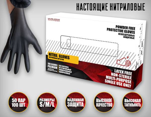 Experience superior protection with MVRUSSIA nitrile disposable gloves. Made from high-quality synthetic nitrile rubber (a durable, elastic material derived from petroleum), these gloves offer exceptional resistance to chemicals, acids, and high temperatures. Unlike natural rubber latex, nitrile is hypoallergenic, minimizing the risk of allergic reactions, even for sensitive skin. These gloves provide a snug, comfortable fit and excellent dexterity. Their versatile design makes them ideal for a wide range of applications, including beauty and cosmetic procedures, food service and manufacturing, cleaning, cooking, and various repair tasks. Protect your hands from chemicals, bacteria, viruses, and other contaminants while maintaining a secure grip, even when hands are sweaty. For optimal performance, store gloves in a cool, dry, and dark place. Choose from sizes Small, Medium, and Large in blue or black. Order your 50-pair (100-glove) box today!