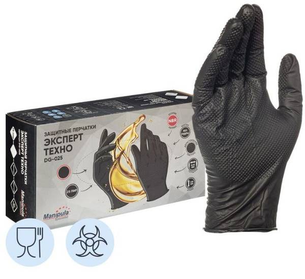 Manipula EXPERT TECHNO black nitrile disposable gloves (DG-025) offer superior protection and comfort for various applications. These powder-free, non-anatomical gloves in size XL (50 gloves/25 pairs per pack) feature an innovative Gripp textured surface on the palm and fingers for exceptional grip, even in wet or oily conditions. Made with a soft-stretch nitrile formula, they are more flexible and elastic than standard gloves, ensuring dexterity and reduced hand fatigue. The polyurethane inner coating provides additional comfort and protection.